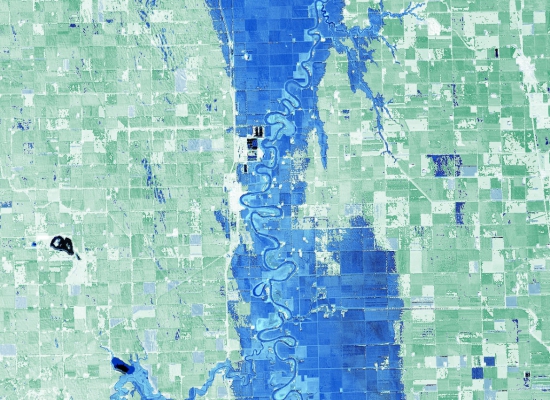 Image of flooded areas from the Red River in Minnesota, USA using NDMI. Captured by Landsat 8- OLI on 17 April, 2020.